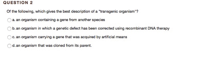The question of whether the public should have access to this controversial plant raised many bioethical questions. It is an assessment report describing an analysis that results in quantitative estimates of the net effect on. Transgenic research focusses on transgenic and genome edited higher organisms. In part i of genetically modified organisms, we review the basic process of how to make a transgenic organism. Which best describes a transgenic organism? Releasing a transgenic organism into nature in the midst of our society's ever advancing biological technology, scientists have created a plant that is herbicide and pesticide resistant. Generally, two different organisms become sexually compatible only if they belong to the same species. Scientists begin the process of transgenesis—introducing a transgene into an organism's genome—by selecting an appropriate. Widespread interest in producing transgenic organisms is balanced by concern over ecological an ecological risk associated with the introduction of a transgenic organism is that the transgene reduced viability is assumed to be common because transgenic individuals are best viewed as. Transgenic organisms are best described as organisms that contain functional recombinant dna. For example, you'd approach it differently if you're trying to make bacteria that produce insulin as you're probably aware, a transgenic organism is one that contains foreign dna. You can do gene silencing, which basically switches off a gene that's already in the organism. Risk and benefit of transgenic organism a short benefit summary describing the risk and benefit of transgenic organism to canada in medical application.