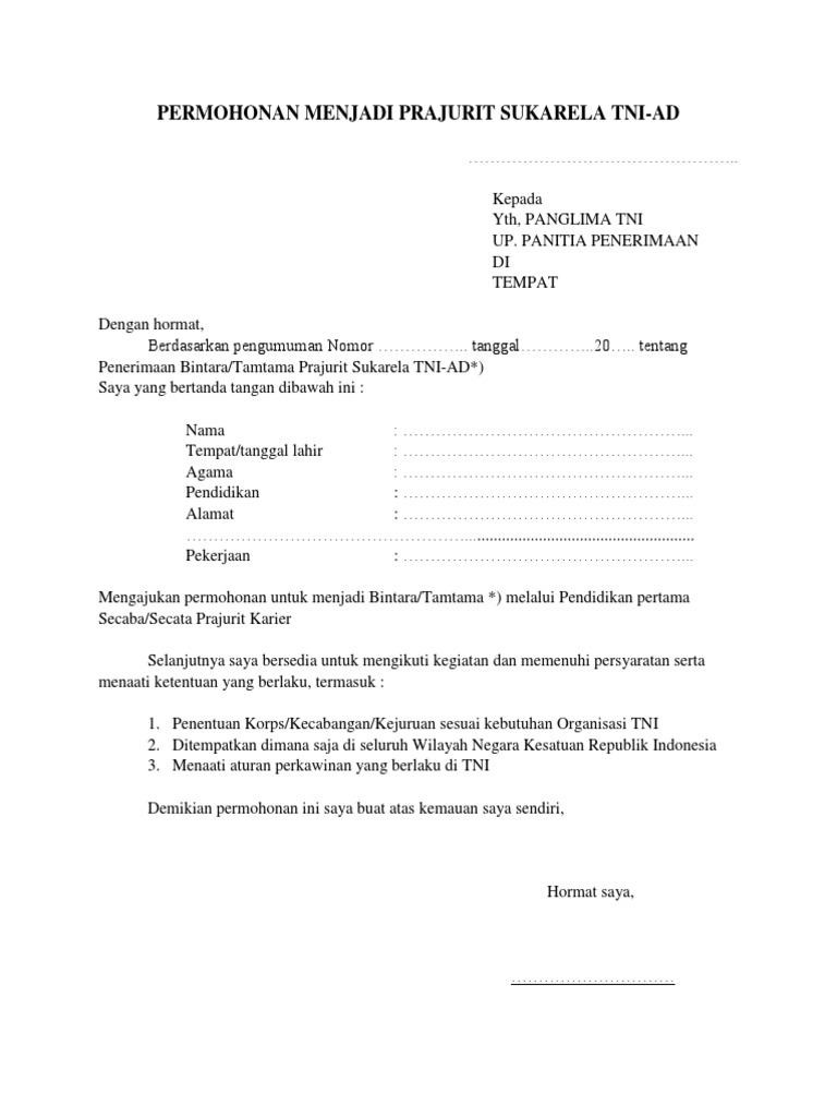 Tidak berkedudukan sebagai calon pegawai negeri sipil atau pegawai negeri sipil, prajurit tni, anggota polri, dan siswa sekolah ikatan dinas pemerintah tidak pernah diberhentikan dengan hormat. Untuk file lain seperti cv. Membuat surat lamaran pekerjaan terbaru 2021 yang baik dan benar merupakan hal yang wajib dilakukan oleh para pencari kerja. Contoh resmi surat lamaran cpns ini dapat anda gunakan sebagai pedoman. Contoh surat permohonan menjadi prajurit tni ad dapatkan contoh.
